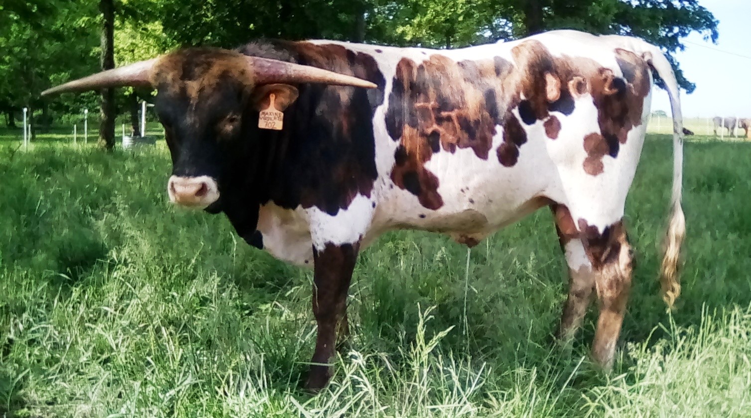 WHITE WITH BRINDLE HEAD AND NECK WITH BRINDLE SPOTS ON SIDES, FOUR BROWN LEGS